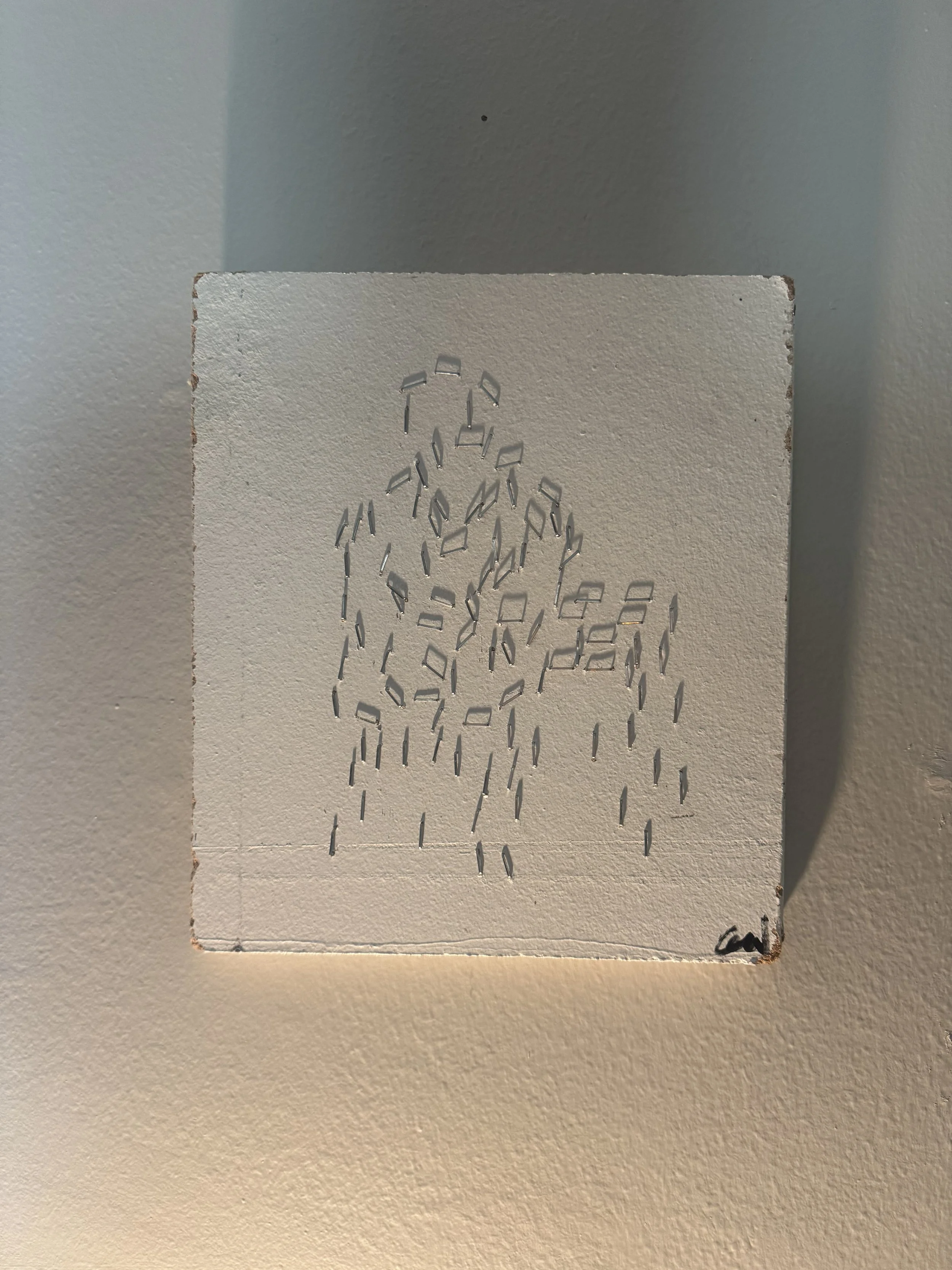 For context: Gavin gave me a picture of a seated man he made out of heavy-duty staples and reclaimed wood panelling for my 40th birthday. I love it so much. I think the figure is playing a guitar. It might be a self-portrait!